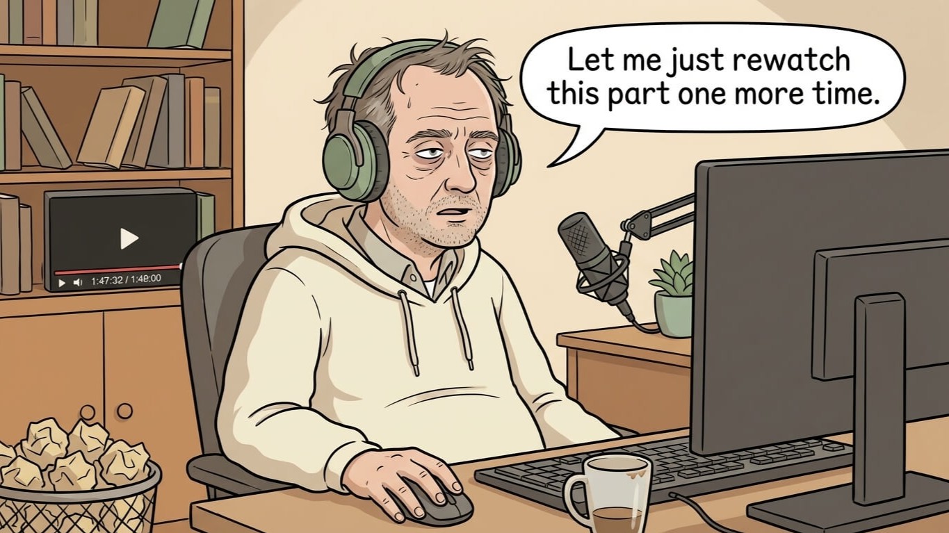 I'd rewatch the whole thing. Scribble timestamps. Write a summary no one reads past the first line. Format bullet points. Link every resource mentioned. Double-check the spelling of my guest's company name. Six hours. Every. Single. Week.