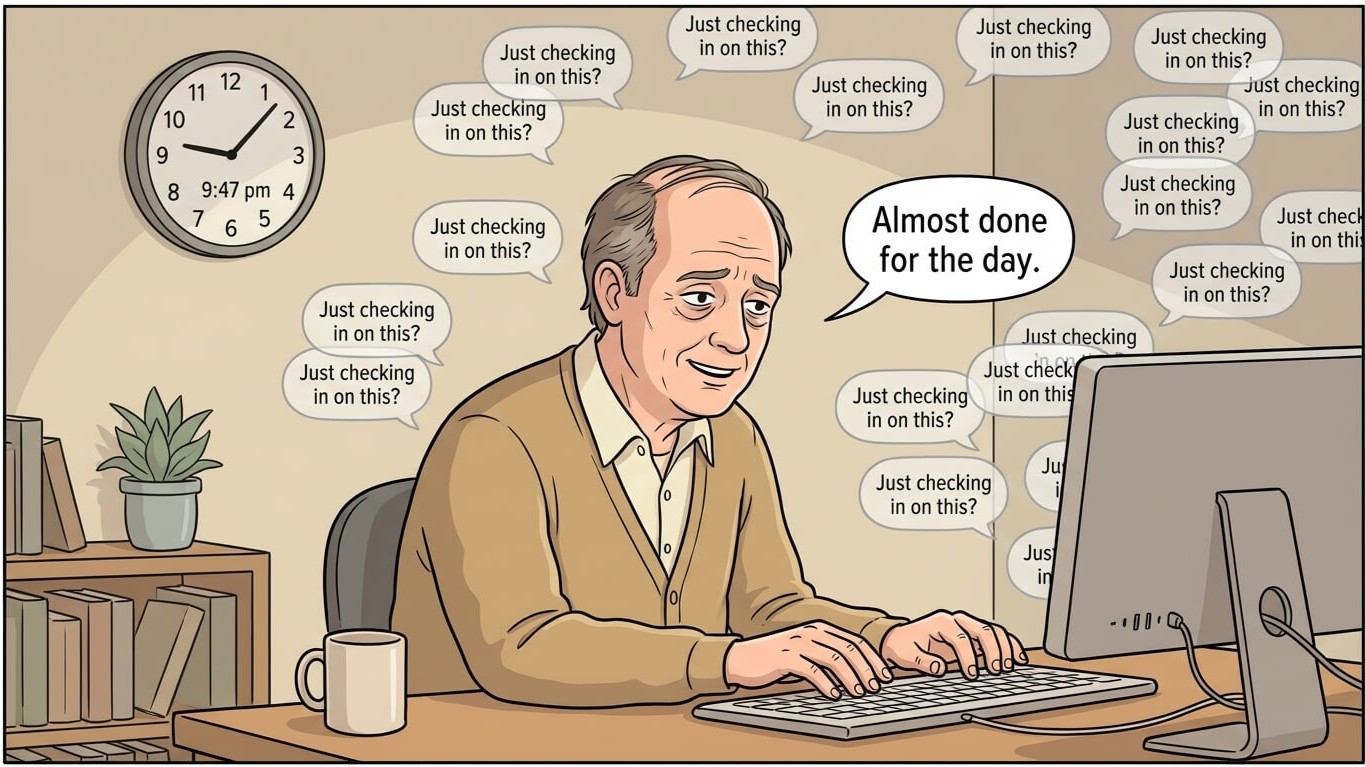 Me, buried under status update emails at 9pm, wondering why I couldn't keep up.