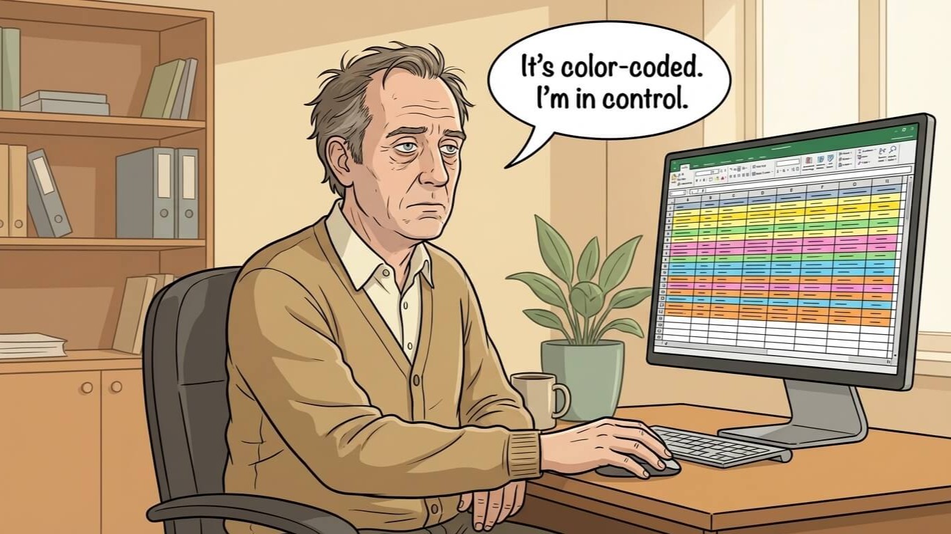 Translation: I spent half my week copying data between tabs, color-coding rows like a maniac, and praying nobody asked for a filter I couldn't build.