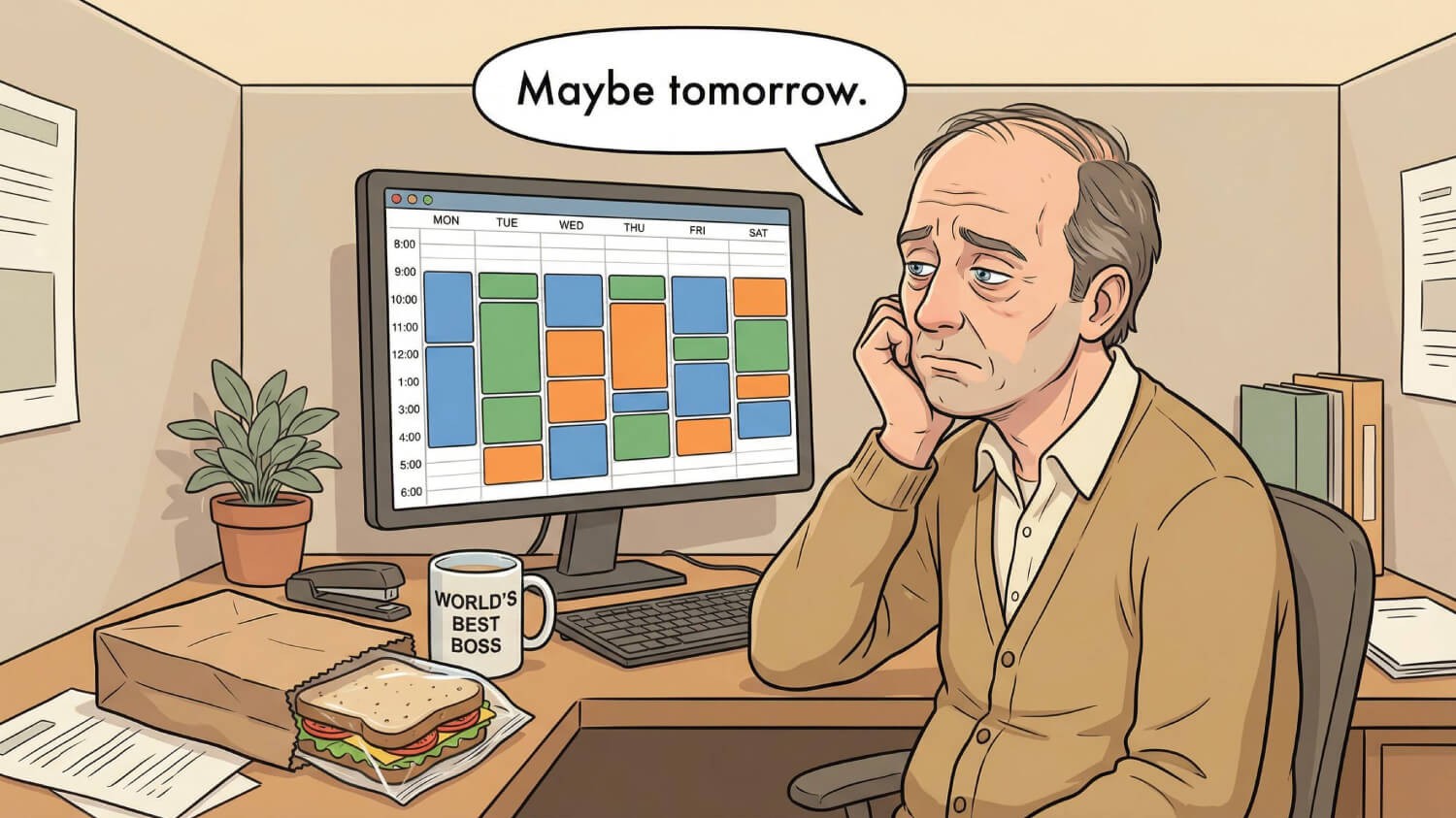 No lunch. No breaks. Meetings stacked like bricks. Every day felt like being slowly crushed by my own schedule. I was drafting my resignation.